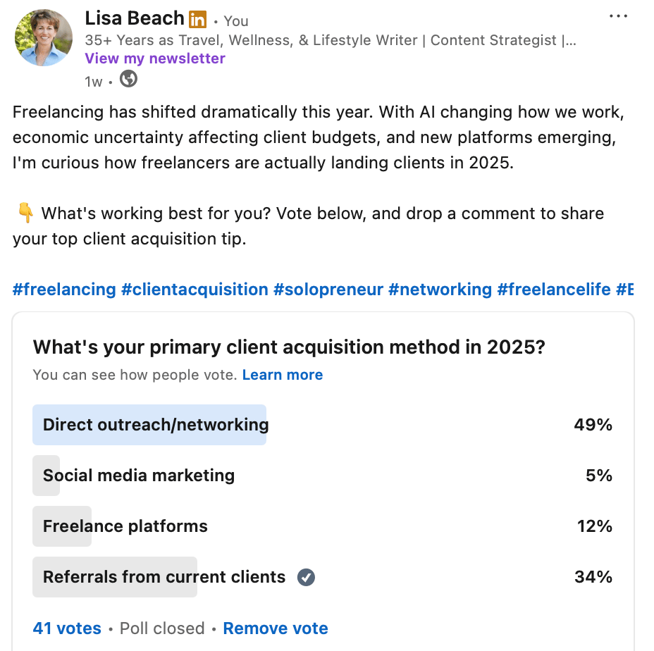 Wondering how freelancers are successfully landing clients these days? Based on my LinkedIn poll, hereâs whatâs working in 2025 for those who responded.